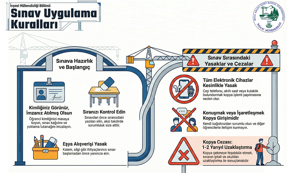 İnşaat Mühendisliği Bölümü olarak, eğitim-öğretim kalitemizi korumak ve ölçme-değerlendirme süreçlerinin (sınavların) çok daha sağlıklı, adil ve düzenli bir şekilde yürütülebilmesi amacıyla oluşturulan 'Sınav Kuralları Yönergesi'ni ekte bulabilirsiniz.